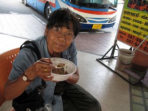 Lundi 9 décembre 2013. Ubon - Paksé ( Laos ). Nous nous rendons à la gare routière de Ubon à neuf heures pour prendre le car jusqu’à Paksé, au Laos, mais il est complet. Peu importe, nous attendrons le prochain jusqu’à quinze heures trente. J’en profite, en attendant, pour aller au centre de Ubon changer un peu d’argent, car à la frontière, il vaut mieux payer son visa en dollars plutôt qu’en bahts. Quand on a l’habitude de voyager par ici, ce sont tous ces petits détails qui finissent par faire sensiblement baisser le coût du voyage. Nous en profitons pour faire quelques emplettes dans un supermarché où les soldes sur les vêtements intéressent Amnoay. Nous allons manger dans un petit troquet où à chaque fois que la cuisinière fait revenir des piments dans son wok, nous manquons de nous étouffer. Tous les clients se mettent alors à tousser et à pleurer, mais personne ne rouspète, car l’on ne peut pas avoir le beurre et l’argent du beurre : si l’on veut que le plat soit correctement relevé, il faut en passer par là !